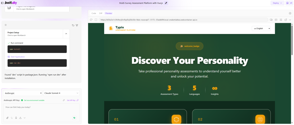 To bring Typix to life, I used Bolt.DIY, an experimental AI coding companion powered by Claude Sonnet 4. Think of it as a supercharged project starter that builds full applications from natural language prompts.
