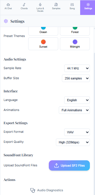 Head to the Settings tab in mITyStudio, scroll down to SoundFont Library, and simply click Upload SF2 Files. Your new instruments will be added to the library instantly. - Test with Audio Diagnostics