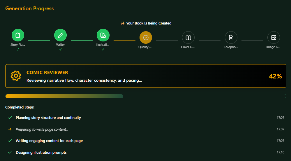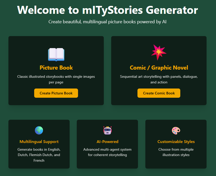 With mITyStories you can create beautiful, professional picture books in English, Dutch (nl-NL), Flemish Dutch (nl-BE), and French using an AI-powered multi-agent generation system.